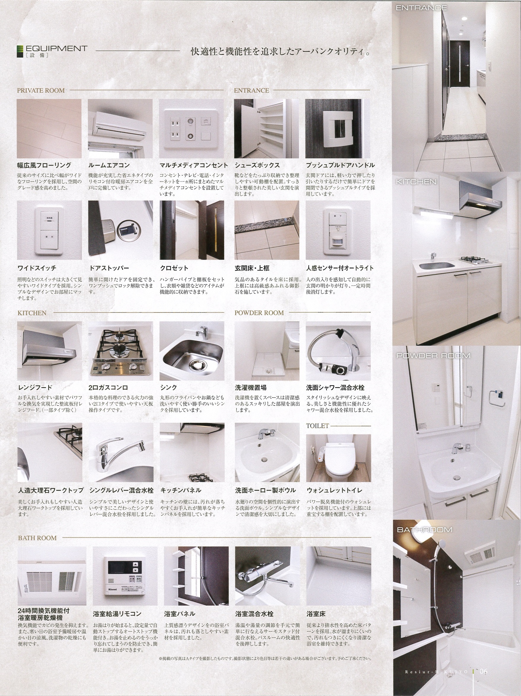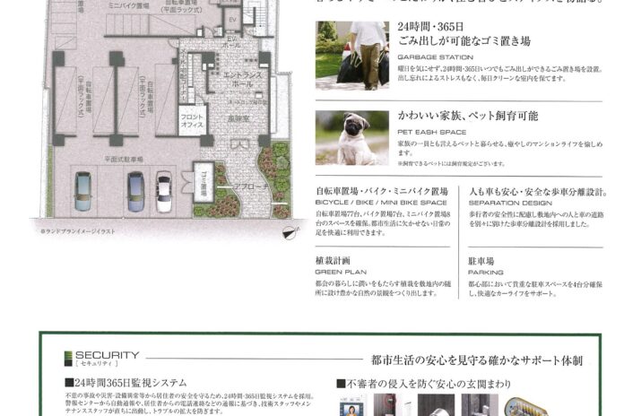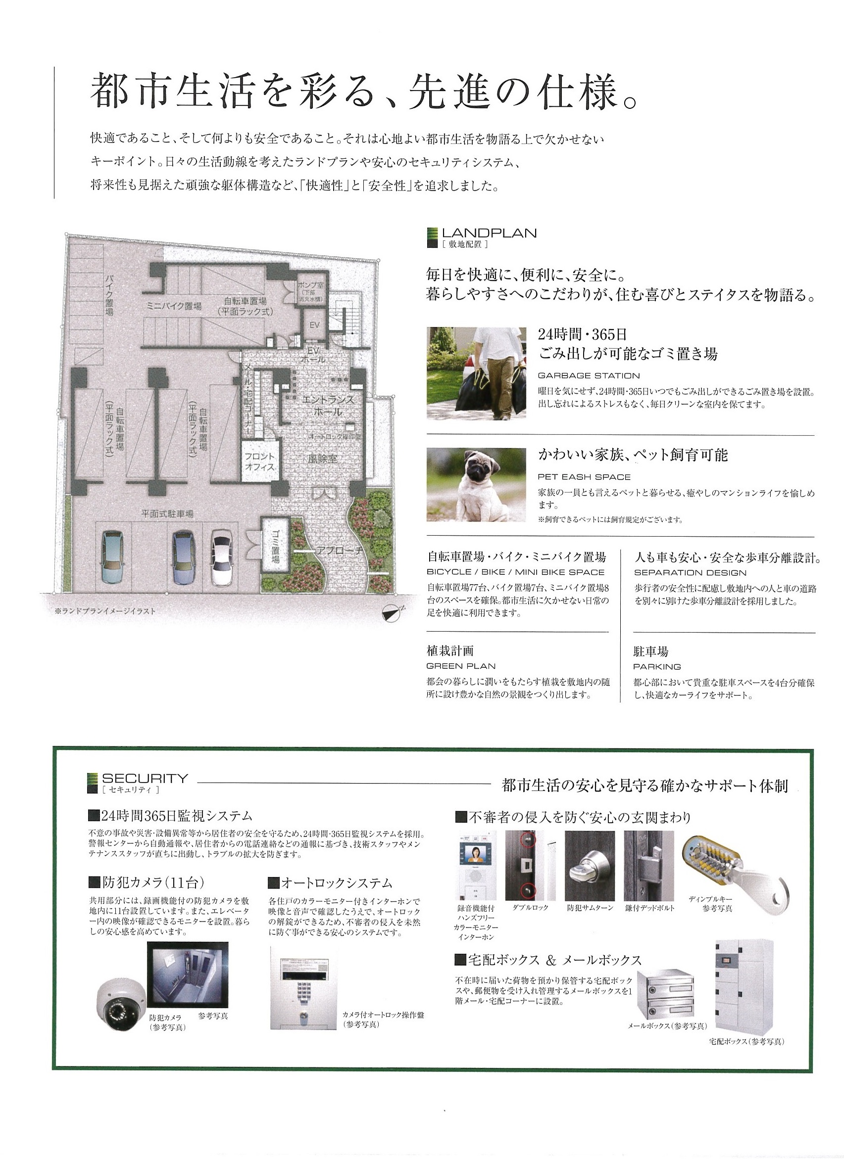 • 防犯設備:防犯カメラ10台(エレベーター内含む)、オートロックシステム(カラーモニター付、住戸内インターホンにて解錠可)